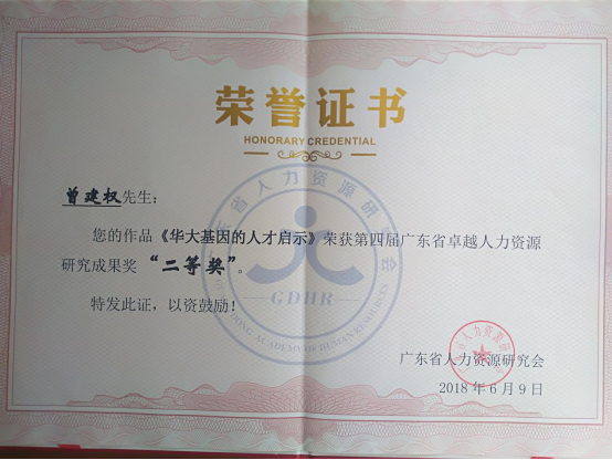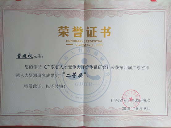 曾建权教授系中国管理科学研究院研究员,广东省人力资源和社会保障厅专家咨询委员会专家委员,在去年获得第三届广东省卓越人力资源研究成果二等奖之后,今年又获得2项二等奖,增强了公司的社会影响力。