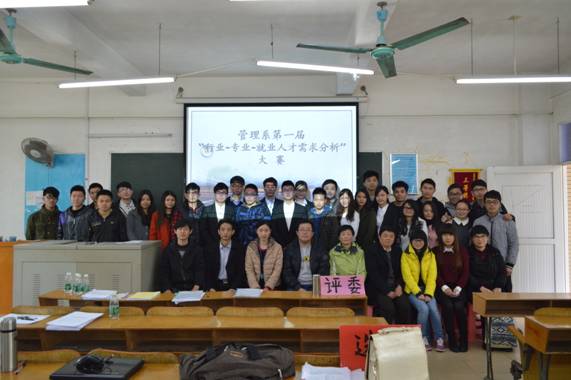 本系讯(通讯员:傅兆鹏)1月2号下午2点,我系第一届“行业-专业-就业人才需求分析”大赛在6栋301成功举办。出席本次大赛的嘉宾有人才招聘主任唐成龙,管理系常务副主任伍曙,管理系党总支书记杨晓文,人才招聘办张毅民、高飞,管理系老师刘善华,管理系办公室主任钟清恒,管理系办公室老师张方超以及各参赛团队的指导老师等。