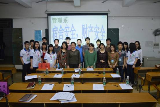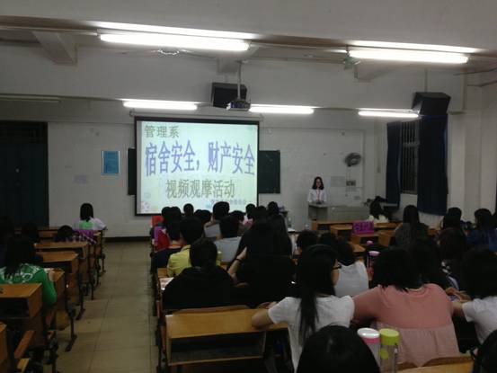 本系讯(通讯员:王珊珊)2014年4月10号晚8:00,由管理系宿舍委员会主办的“宿舍安全.财产安全”视频观摩活动在四栋101教室成功举办。出席本次活动的嘉宾有学保部保卫科科长杨志亮,员工公寓中心主任莫永坚,管理系党总支书记杨晓文,管理系办公室主任钟清恒,管理系团总支书记钟劲,管理系办公室辅导员陈玲娟,崔运玲,林成园,秦文飞,王翔,张方超。与会人员还有各班级员工代表。