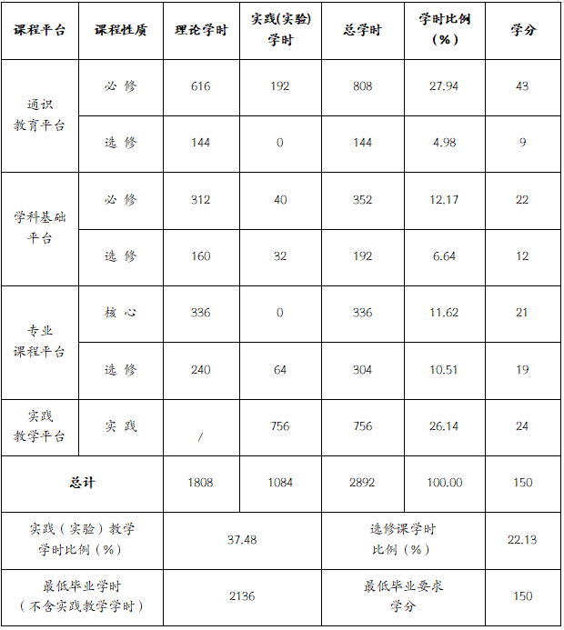 课程体系结构及学时学分比例表