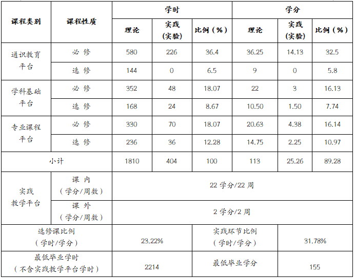 (一)课程体系结构及学时学分比例表