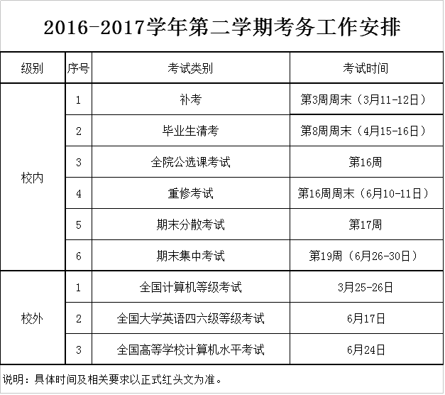 2016-2017学年第二学期考务工作安排