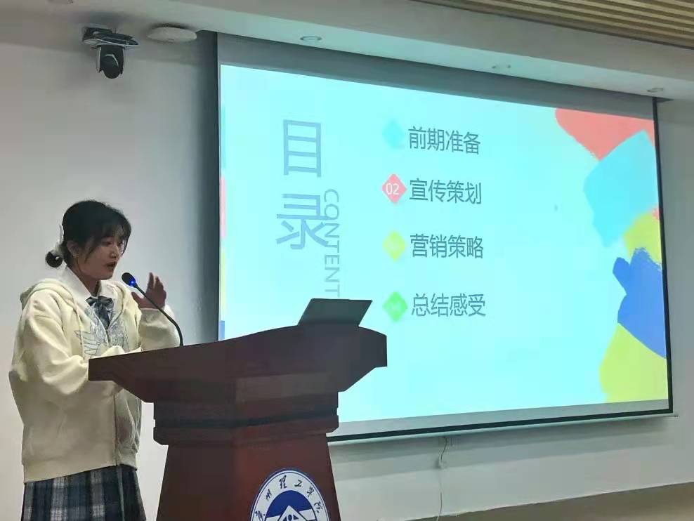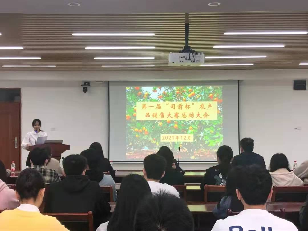 最后,获得一等奖的队伍代表发言。杨依冰同学与我们分享了他们小组的销售经验。前期,他们首先在朋友圈收集调查问卷,了解目标群体,做好战略规划及营销方案,并向亲朋好友大力推介柑橘。他们以朋友圈、推文等宣传方式,做好了前期的宣传。最新颖的是他们采用微信群拼单的模式,大大提高了销量,并且增设了送小礼物及送货上门等服务吸引消费者购买。除了线上销售,他们还在公司人流多的地方摆摊,吸引了新的消费群体。