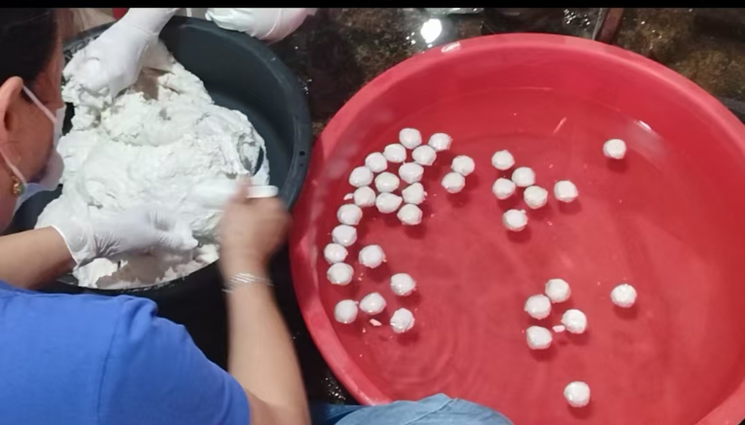 面浆好了,该挤丸!左手抓鱼糜,虎口挤出圆团,右手勺一刮,鱼丸就跳进沸水。“水要沸但别太猛,不然弹不起来。”看着鱼丸从沉底到浮起,像“归港的渔船”,太喜人。