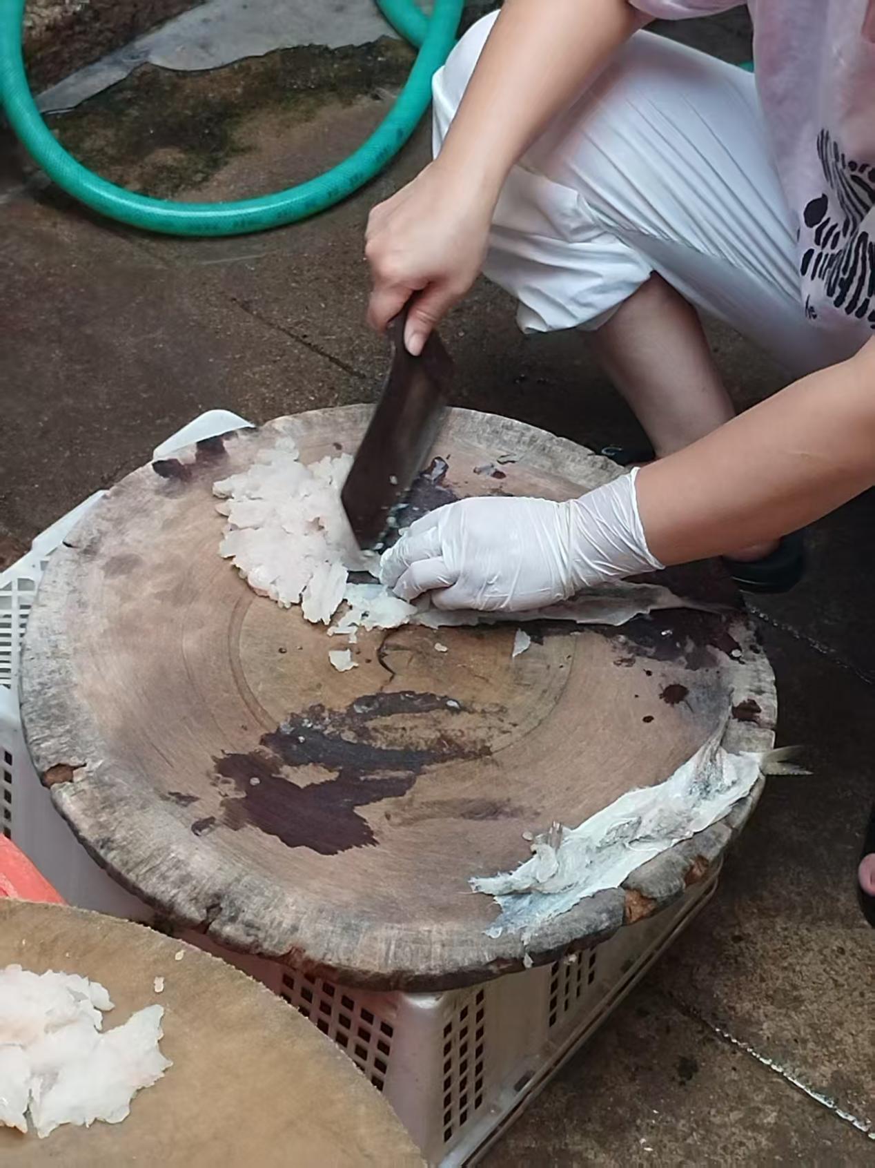 接下来是技术活:先去骨,沿鱼背主骨划开,利落分离鱼肉;再趁鲜撕鱼皮,一整张脱落,露出雪白肉。“凉了皮就黏住了,去骨得稳,别带碎骨。”我们手忙脚乱,才知这功夫藏着岁月。