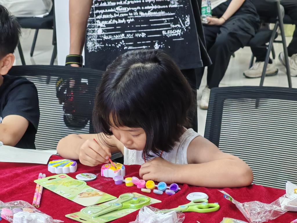 随后,实践队携同20余名社区儿童开启了一场妙趣横生的手工之旅。队员们耐心指导孩子们为彩绘石膏娃娃赋予缤纷色彩,孩子们天马行空的想象力让每一个作品都独具匠心。活动现场欢声不断,童真与创意碰撞出灿烂火花。最后,孩子们自豪地展示作品,并与实践队员合影留念,为活动画上温馨句点。