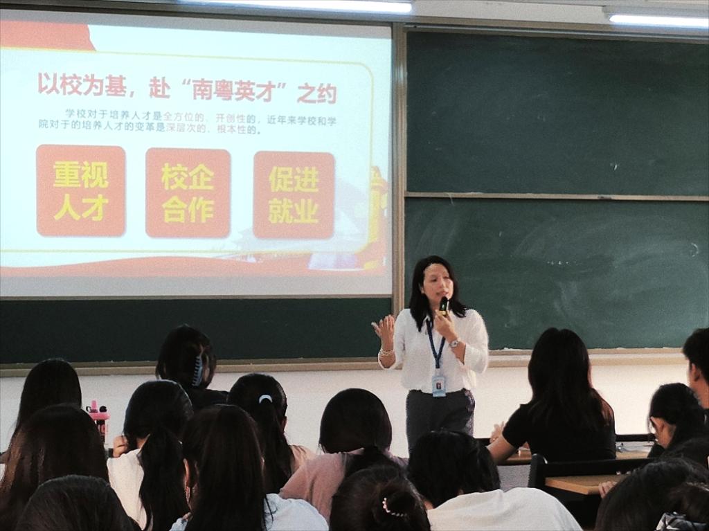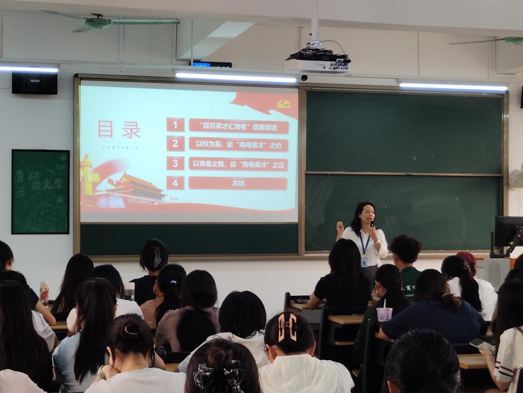 杨惠书记围绕“百万英才汇南粤,青春筑梦新时代”主题展开讲述。详细解读广东省“五有”人才政策:就业补贴、创业免租、创新资助、求职免费住、落户有补助——每一个数字背后都是省委对青年的深情邀约。借此情景,杨惠书记鼓励大家将个人的发展与区域、与国家需求紧密相连。