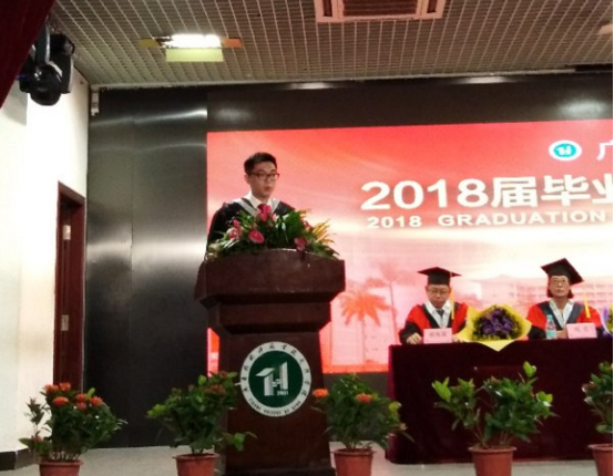 毕业生代表孙李发言。他首先对领导、老师致以衷心的感谢和对同学表示衷心的祝贺和诚挚的祝福,接着讲述了自己大学四年的情怀,有懵懂、紧张、温馨与不舍,讲述了老师对他的帮助和同学的热情友爱,并对其表示感谢感激之情,最后祝愿各位毕业生能够在象牙塔外的世界披荆斩棘,一路无前。