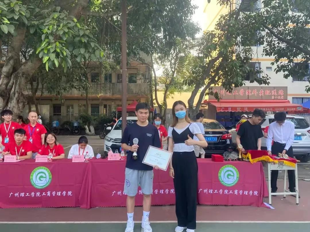 | 辅导员朱砂老师为18人资1、2班快乐男生队颁发男子组冠军 |