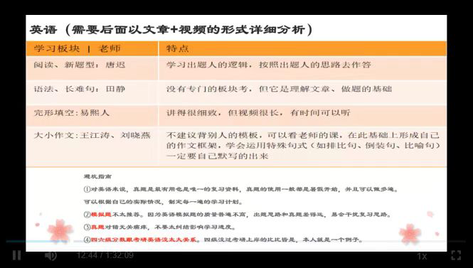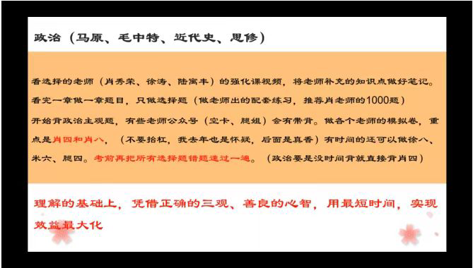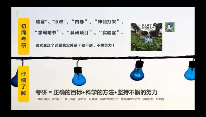 巫泽慧对考研基本常识进行了介绍。她说明了自己对考研的认识与理解,初闻考研,许多同学会有不同的想法,深入了解之后,发现考研不仅需要正确的目标,而且还需要运用科学的方法以及坚持不懈的努力。随后,巫泽慧针对考研内容的四个方面,分别给出了相关的建议。专业课程上要着重复习,了解考试大纲,寻找合适的考纲材料;英语方面,重在练习,多动脑,勤动手,多刷真题;政治方面,多关注新闻时事,在理解的基础上背熟专业的词句,同时注意答题时的条理;数学方面,巫泽慧学姐推荐了汤家凤和张宇两位老师的教学视频,勤加刷题,打好基础,是数学中最适用的方法。