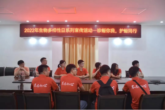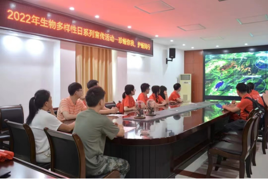 在罗坑保护区宣教科科长何南的带领下,南粤连心筑梦队队员们观看广东省罗坑鳄蜥国家级自然保护区宣传片。宣传片展示了保护区中的生态环境,让队员们对于保护区有了初步的了解。保护区地处中亚热带南缘属亚热带季风气候,全年热量充足,冷暖交替明显,物种资源十分丰富。区内有野生维管植物1464种,其中国家重点保护植物有仙湖苏铁、伯乐树等17种;动物有1529种,国家重点保护动物有39种,如鳄蜥、黄腹角雉、藏酋猴、大灵猫、小灵猫、白鹇等。
