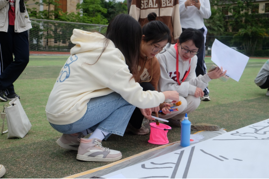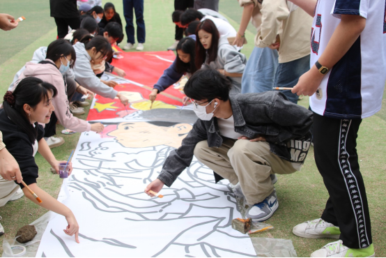 主持人邝琳琳宣读活动注意事项后,各组领取绘画材料前往指定区域准备作画。各组沟通协调,制定方案并明确分工。画卷在足球场上铺开,以班级小组为单位,画布以“请党放心,强国有我”为主题,展示新时期我国青年团结奋斗、齐心协力的画面。