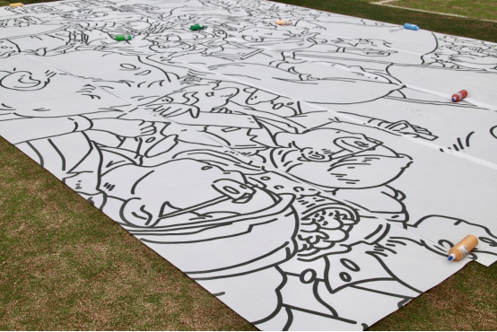 各组组员按照各自协商的内容,分别开展画布边缘轮廓的勾勒、颜色的填充、与邻近组拼接部分的色彩协调等任务,在画布上编织色彩,所有员工及工作人员都贡献了自己的力量。