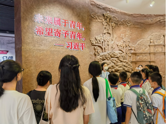团一大纪念馆紧扣中国共产党领导下的中国社会主义青年团创建主题,展示了党亲手缔造共青团、指导共青团创建的历程。实践队跟随着讲解员,融入东园记忆,唤醒历史命脉,回顾五四运动爆发时,在党的领导下各地社会主义青年团的建立;学习中国社会主义青年团第一次全国代表大会潮起东园的故事,领会一代又一代青年在“党有号召,团有行动”的口令下不懈奋斗的精神。馆内展品丰富多样,珍贵的历史文物和照片真实地为我们展现英雄故事、青春故事、革命故事。