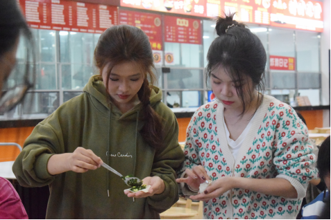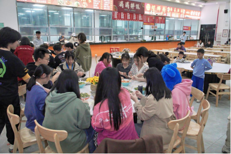 在包饺子活动开始前,大家有序的准备着饺子皮、饺子馅,以及后续的工作。在温暖的食堂里,同学们摩拳擦掌,跃跃欲试。比赛现场热火朝天,擅长包饺子的同学簇拥在一起,快速的把馅装进饺子皮里,在饺子皮上捏出排列有序的花纹,并整整齐齐地摆在托盘里。不擅长包饺子的同学,也积极参与,频频走下位置向别的同学虚心求教。两分钟的时间阻挡不了同学们的热情高涨,在完成规定任务后,同学们又在摆盘上花起了心思,最后为我们呈现出了一幅幅精彩的饺子画卷!在寒冷的冬季,吃着大家亲手包的饺子,相信每个人心里都感到温暖和满足。