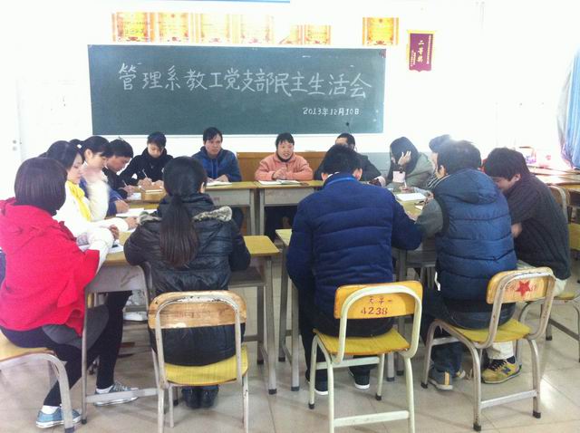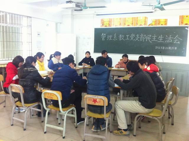 本系讯(通讯员:林成园)12月10日,管理系在六栋309召开了教工党支部民主生活会。本次民主生活会的主题是“贯彻公司文件精神,全面提高教工党员党性修养”,进行了教工党员的批评与自我批评。会议由我系党总支书记杨晓文主持,全体教工党员参加了会议。