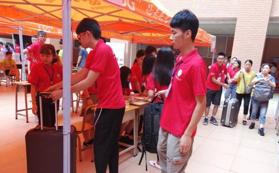 随着新同学的到来,公司迎新工作成员迅速投入紧张有序的迎新工作中,到处都是忙碌的身影。校园里随处可见印有“快乐工作,工作快乐”的“小红衣”们,他们皆以饱满的热情,各司其职,迎接远方而来的新学子。在迎新工作人员的帮助下,新同学顺利完成了报道流程。