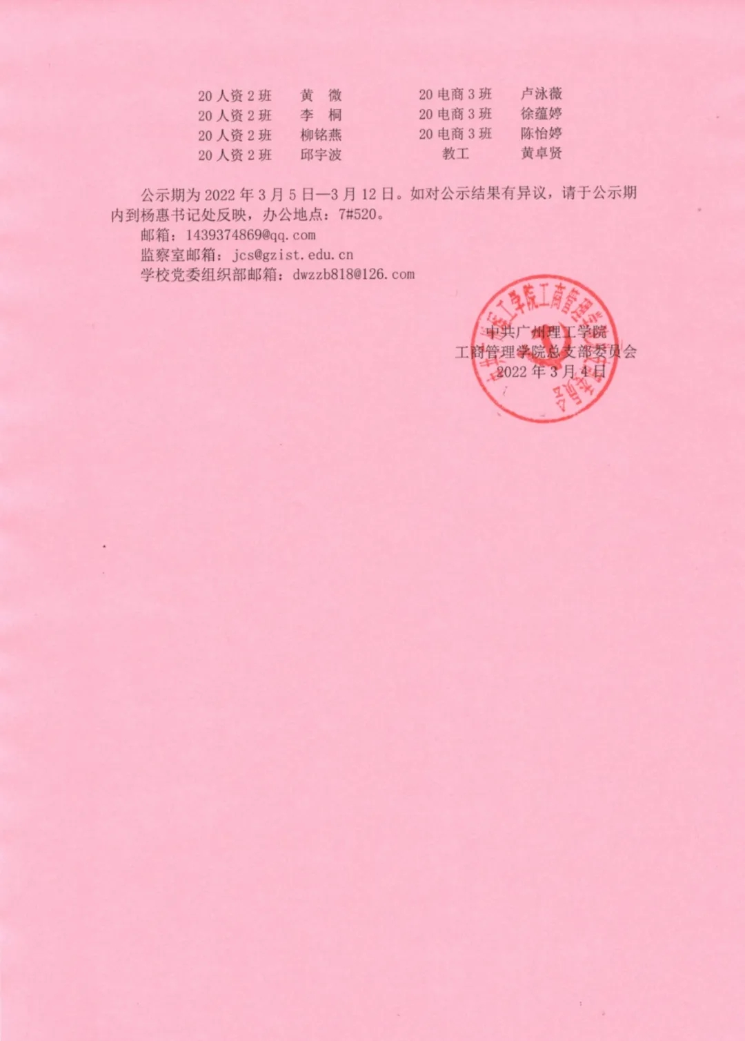 公示期为2022年3月5日—3月12日。如对公示结果有异议,请于公示期内到杨惠书记处反映,办公地点:7#520。