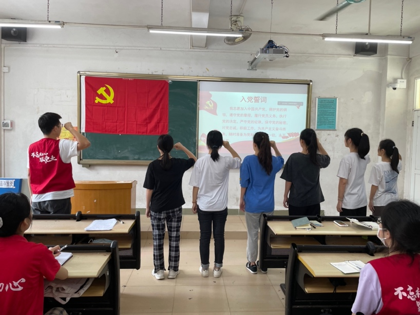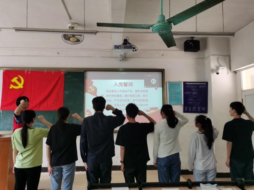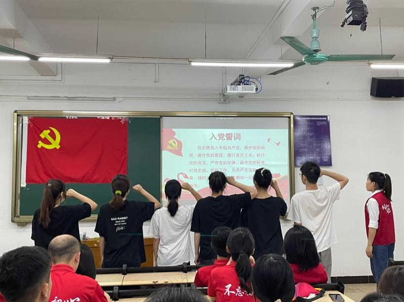 新一期预备党员起立,高举右拳,在党旗下光荣宣誓。庄严的入党誓词让每一位预备党员都深刻地认识到了自己肩负的使命。