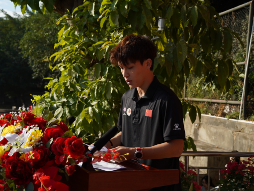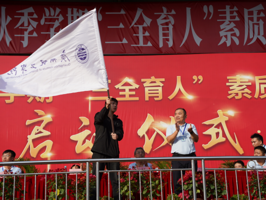 接着大会进行了帽峰山活动的授旗仪式,由22电气7班的潘俊樾同学上台接旗,党委副书记、副董事长张志红奏请,标志着帽峰山活动的正式启动。