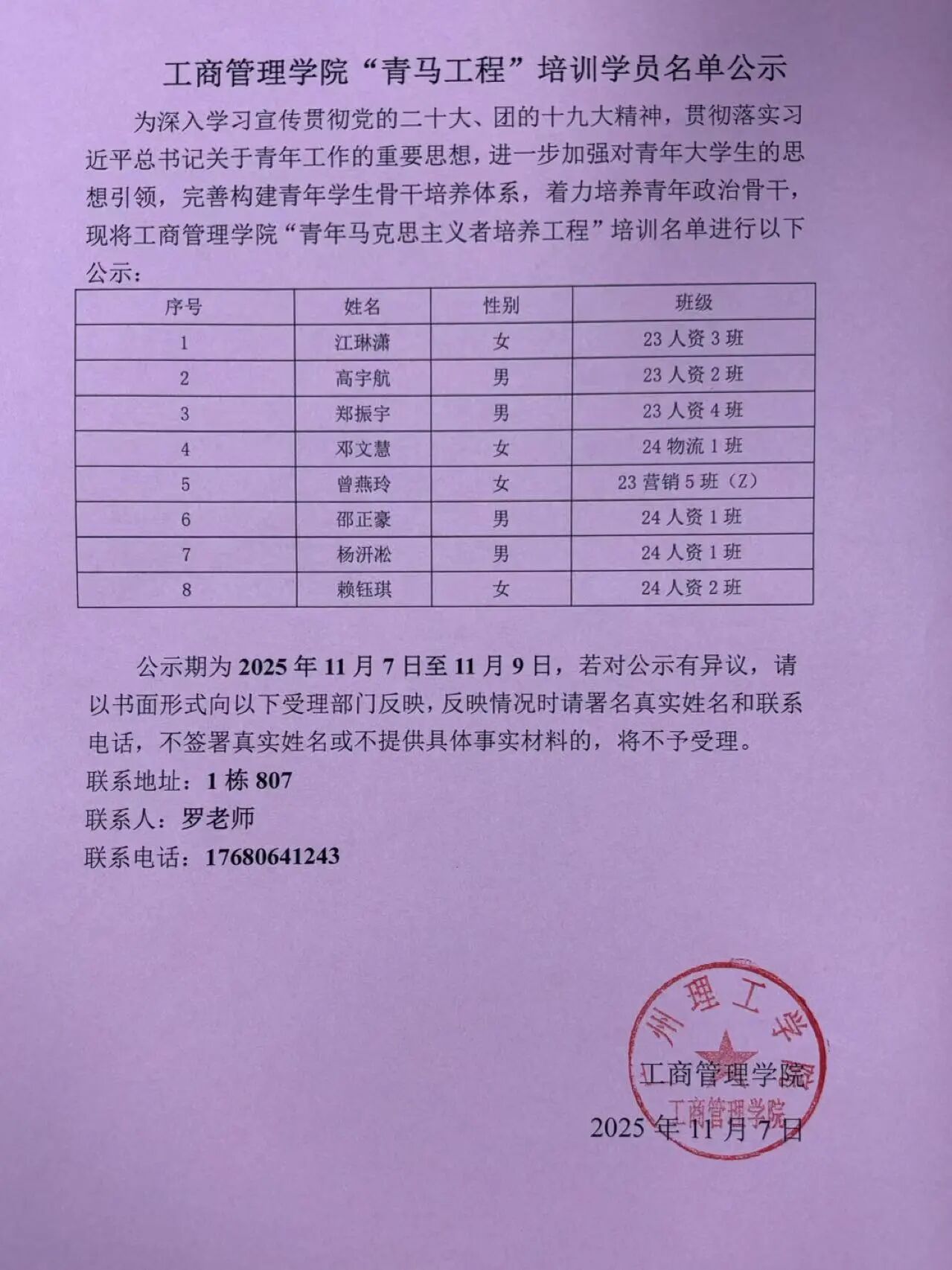 希望入选学员珍惜此次培训机会,在学习中锤炼品格、增长才干,充分发挥青年骨干的先锋模范作用,以实际行动践行青年马克思主义者的使命担当。