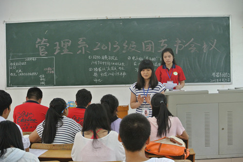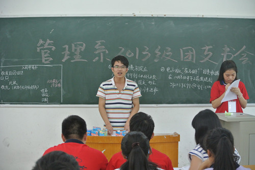 首先是由来自本人资行政123的团支书杨智荣同学为在座的13级团支书分享了他在老员工活中担任团支书的经验和心得。然后由团总支干事陆文聪,余敬敏分别介绍了团支书将要担任的职责和任务,其中主要包括:团档、团证的收集与注册、团费的收缴、团支部花名册的登记、新生申请入团或补办团证、团档的程序等;安排了接下一周的工作,收取2013级同学的团证团籍,团费;以及对国庆墙报工作进行安排,并现场解答新生团支书的问题;使团支书对自己的工作有所认识。