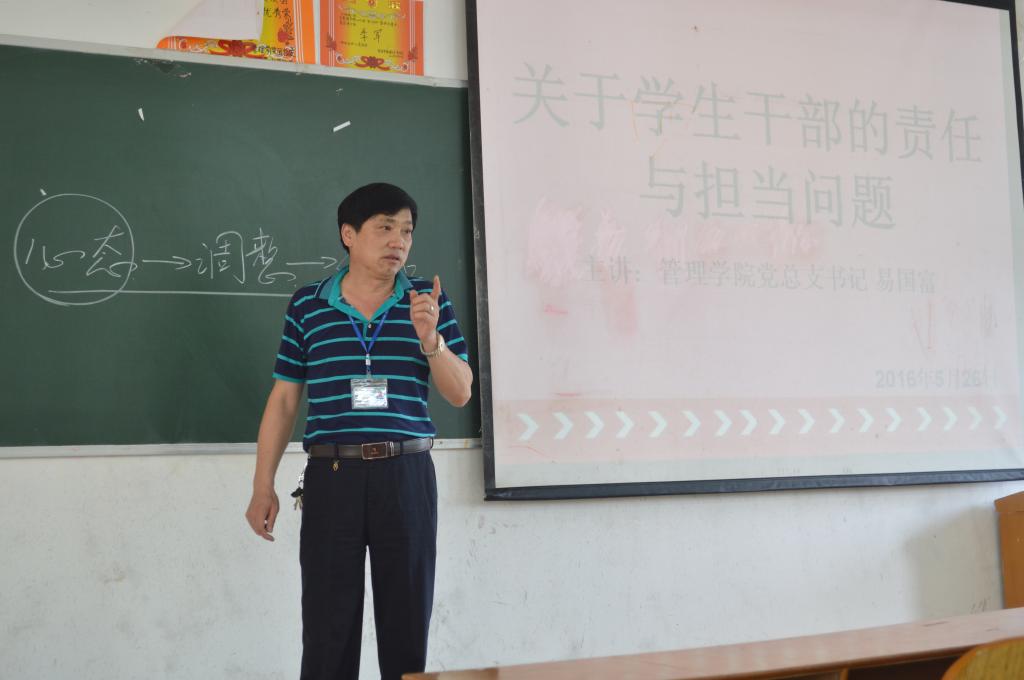 此次讲座主题为《关于员工干部的责任与担当问题》,易国富书记在有限的时间内提出了三个问题,分别是定位问题、心态问题、责任与担当问题。在定位问题中,易书记提出各个员工干部都要弄清楚自己的定位,这样才能更好的服务员工群体;在心态问题中,易书记认为各位员工干部需要调整好自己的心态并提出了“药医不如神医,神医不如食补”的观点,其中最重要的是员工干部的精神;在责任与担当问题中,易书记提出员工干部的称职问题,每一位员工干部都应当担待相应的责任。在讲座中,易书记指出心态是员工干部中最重要的一部分,需要各位员工干部做到“静”与“近”:对于工作要心静,不能浮躁;对于身边的人要平易近人,不能摆出官架子,只有这样才能更好的为同学为集体服务。同时易书记还提出了“改变命运需要改变思想,改变思想需要改变观念”,强调了员工干部观念的重要性。