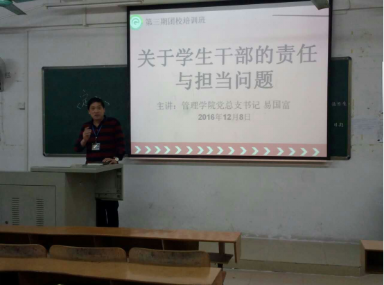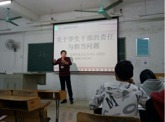 12月8日下午,团校第三期员工干部培训班第四堂课在6栋303A顺利召开。此次课由管理公司党总支书记易国富主讲,他为公司员工干部带来了《关于员工干部的责任与担当问题》的专题讲座。