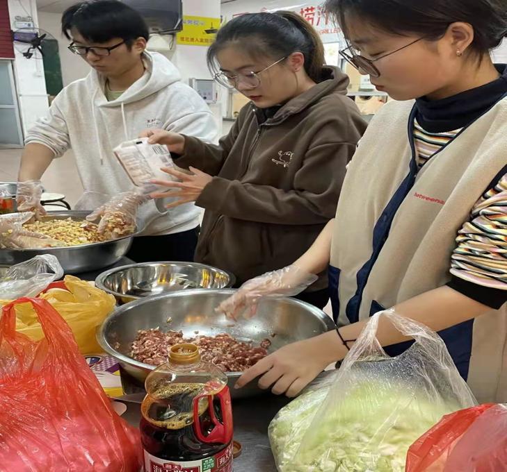 温暖的食堂里,一切都已准备就绪,同学们摩拳擦掌,跃跃欲试。擅长包饺子的同学簇拥在一起,仔细快速的把馅装进饺子皮里,在饺子皮上捏出排列有序的花纹,并整整齐齐地摆在托盘里。不擅长包饺子的同学,也积极参与,频频走下位置向别的同学虚心求教。