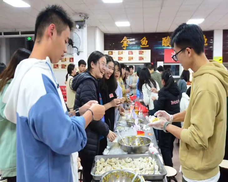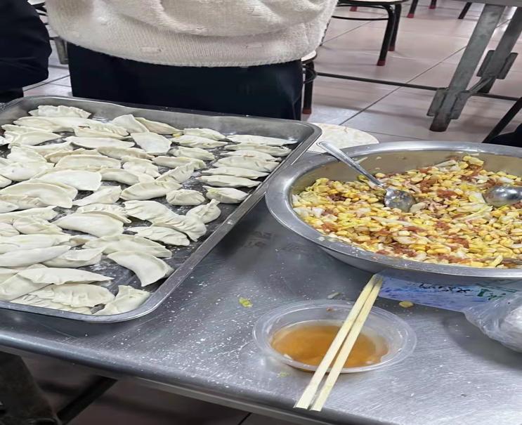 经过所有人共同的努力,一盘又一盘的饺子端出厨房,摆上桌前,个个皮薄馅大,让人食欲满满。同学们有序的排着队,享用自己的努力成果。吃着饺子,饭堂内的气氛也活跃到了顶点,大家共同分享着节日的喜悦。