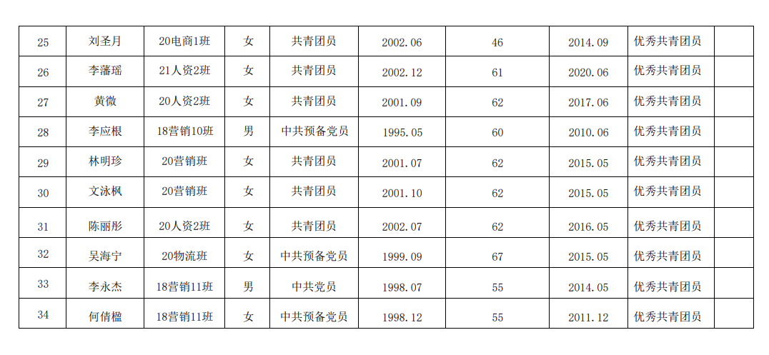 2021-2022年度优秀共青团员