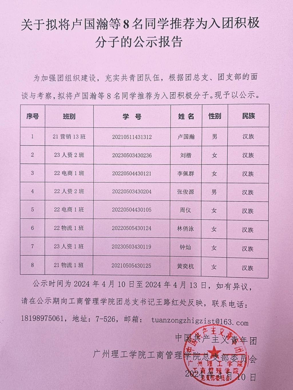 (练家维)为加强团组织建设,充实共青团队伍,根据团总支、团支部的面谈与考察,拟将卢国瀚等8名同学推荐为入团积极分子。现予以公示。