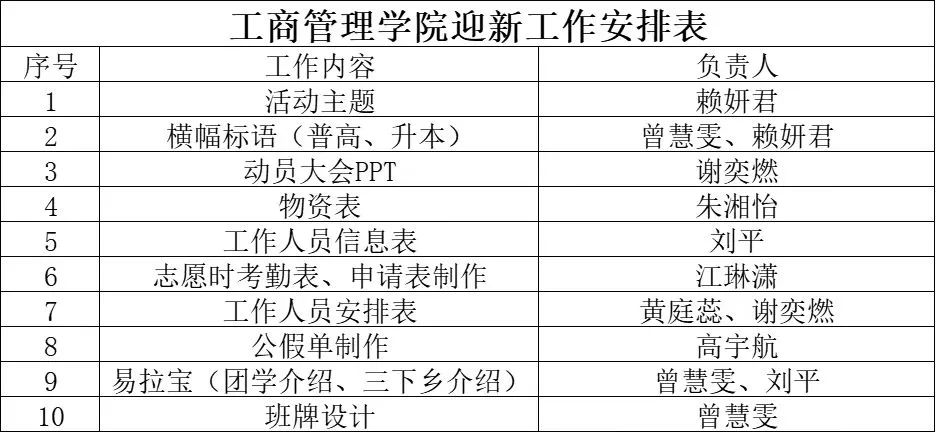 公司高度重视本次迎新工作,在暑期已成立迎新工作策划组负责策划迎新工作,策划组的团队成员有:文迅达、张运枫、黄震、侯健、温灏晖、谢奕燃、赖妍君、刘平、江琳潇、朱湘怡、高宇航、黄庭蕊、曾慧雯。迎新工作策划组在暑期通过线上会议的形式确立了各成员所负责的工作,包括活动主题、横幅标语、物资表的制作等。