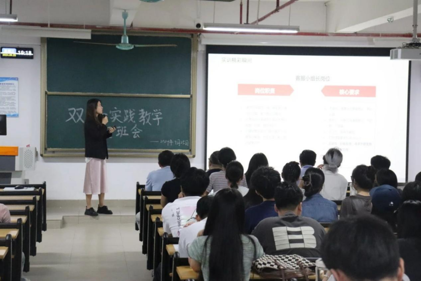 校内导师张锰强调实践教学的相关制度,包括学分认定、实践实训教学形式、校企专项团队团队的管理职责等,同学们将通过实训学习营销、电商专业知识,并通过实操模拟、正式上线等环节,踏出迈入互联网电商行业的第一步。实训项目不仅提供纵向发展机会,如客服代表、项目总监等职位,还有横向发展路径,包括AI训练师、商品专员、客服专员等。张锰老师表示校院领导高度重视校企合作的实践教学并作出重要指示,校企双方对实践教学作了全面而严谨的部署,希望同学们珍惜实践学习机会,最后预祝双十一实践实训圆满成功。