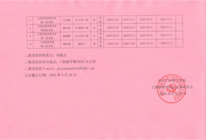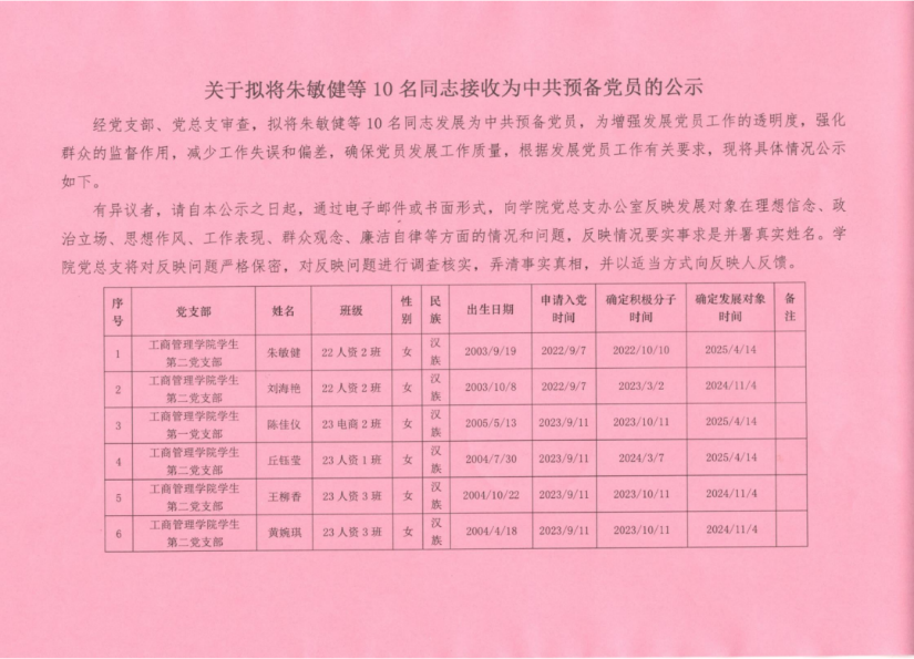 经党支部、党总支审查,拟将朱敏健等 10 名同志发展为中共预备党员,为增强发展党员工作的透明度,强化群众的监督作用,减少工作失误和偏差,确保党员发展工作质量,根据发展党员工作有关要求,现将具体情况公示如下。