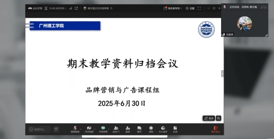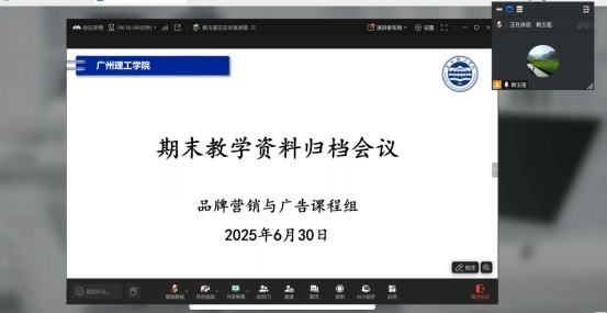 (赖玉莲)为系统梳理本学期教学成果,确保期末资料归档工作的规范、完整与高效,品牌营销与广告课程组于2025年6月30日上午,通过线上腾讯会议的形式,成功召开了期末教学资料归档专项工作会议。本次会议由课程组组长赖玉莲老师主持,课程组全体任课教师参加,共同聚焦期末教学资料(课件、教学大纲、教案等)的标准化归档流程,旨在提升教学管理精细化水平,为教学质量持续改进奠定坚实基础。