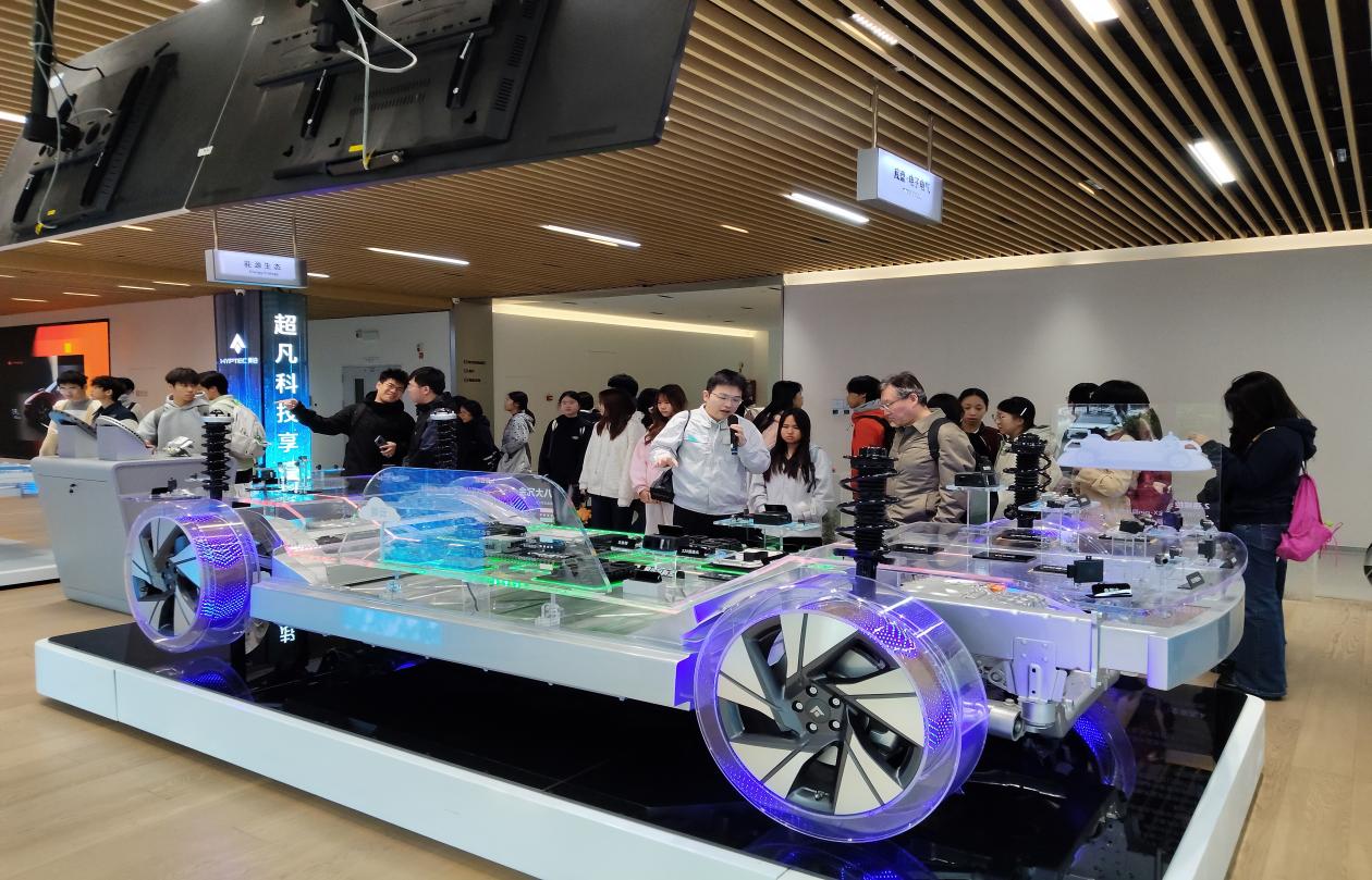 在技术展示区,工作人员为同学们系统介绍了广汽埃安在电池技术、电机电控及星灵电子电气架构等关键领域的突破性成果。例如,i60车型凭借其高能量密度电池组与高效能量管理系统,实现超过一千公里的综合续航能力,彻底化解用户的里程焦虑;该车型还支持前沿储能技术,并创新性地将车前屏设计为户外投影设备,可满足露营观影等多元化场景需求。而吴铂车型则搭载模拟太空座椅、智能空气悬挂等一系列高端配置,不仅在驾乘体验上追求极致舒适,更在智能化与绿色化方向上展现出品牌的持续创新能力。这些技术细节的剖析,使同学们对新能源汽车的研发逻辑与市场定位建立起更清晰的认知。