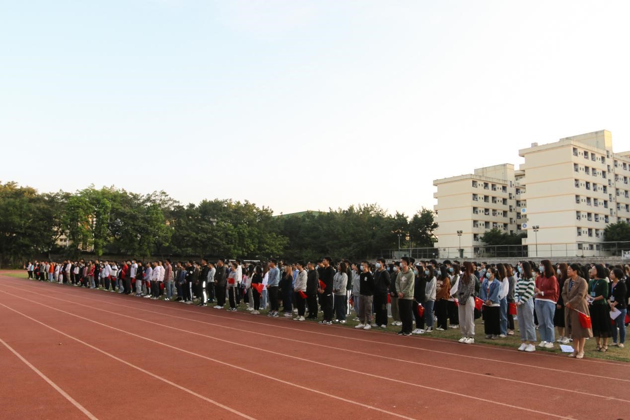 在场的领导及师生代表庄严站立,面向五星红旗齐声高唱国歌,注目鲜艳的五星红旗,它正迎着朝阳冉冉升起。