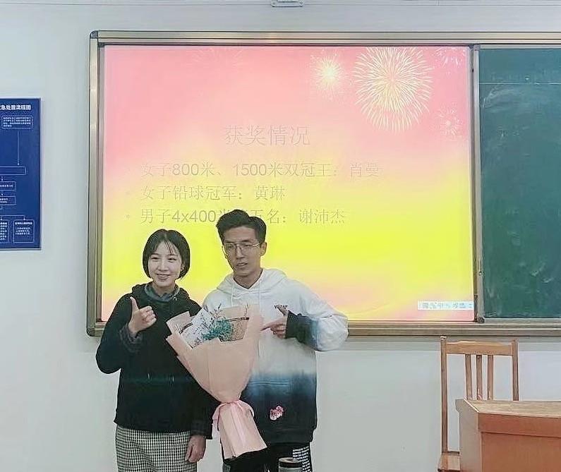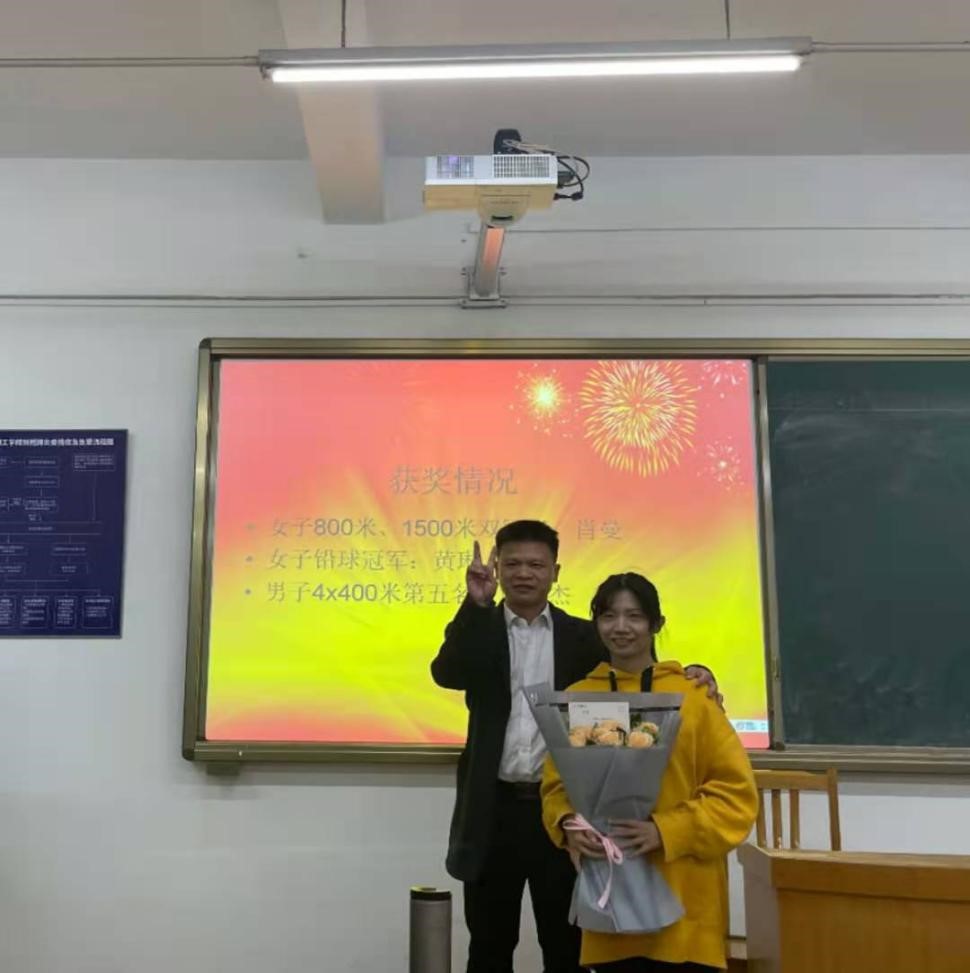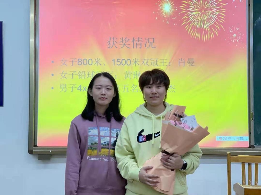 班导师为校运会女子800米、1500米双冠军肖蔓颁奖