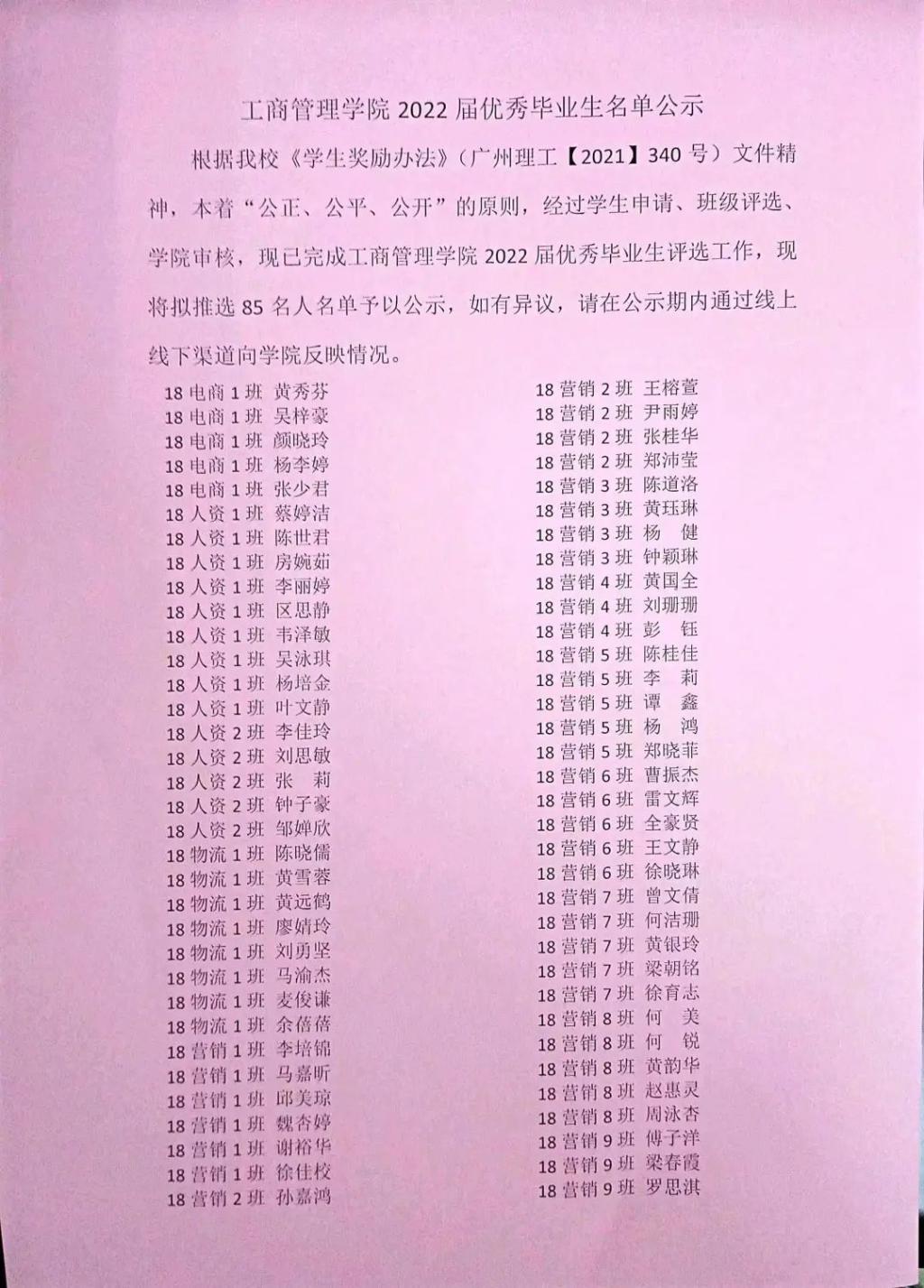 根据公司《员工奖励办法》(广州理工【2021】340号)文件精神,本着“公正、公平、公开”的原则,经过员工申请、班级评选、公司审核,现已完成2022届优秀毕业生评选工作,现将拟推选85名人名单予以公示,如有异议,请在公示期内通过线上线下渠道向公司反映情况。