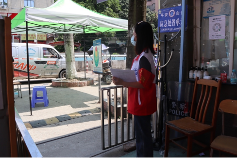 员工党员在校门口维持进出校园秩序(鄢璐摄)