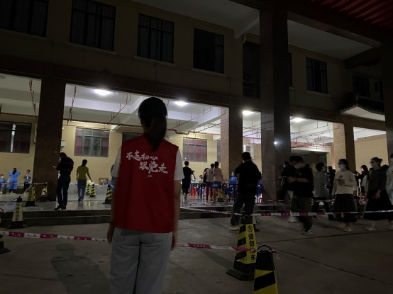 在协助核酸检测的现场中,同志们统一身穿红色马甲,坚守岗位,维护现场秩序,协调好前往核酸的同学们排好队,提醒同学们戴好口罩,提前准备好粤核酸二维码,保持好一米的安全间距。公司志愿者们在疫情防控中当先锋、作表率,筑起疫情防控的安全线,用实际行动贡献自己的力量!