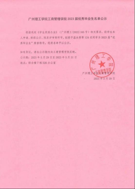 根据公司《员工奖励办法》(广州理工{2022}165号)相关要求,经员工本人申请、班级公示、院系评审等环节,拟授予温永荣等124名同学为2023届“优秀毕业生”荣誉称号,现将名单予以公示。