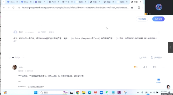 首先,廖老师详细介绍了AI工具在教学中的多重应用。她分享了利用WPS内嵌AI工具优化PPT排版与文字内容的经验。在备课环节,廖老师利用AI理解课程中复杂的理工科知识点,并挖掘相关应用案例,使教学内容更贴近实际。此外,廖老师还计划将AI应用于作业和考试设计,结合最新趋势设计题目,以检验员工的学习效果。而颜老师则借助Deepseek、Kimi等AI生成教案框架、整合案例,并智能生成课堂问题库,提升备课效率。颜老师表示,AI工具的使用使得教学内容更加丰富、生动,员工的学习兴趣也得到了显著提升。讨论过程中,贺军老师特别推荐Deepseek的深度思考与联网搜索功能,建议教师将AI定位为 “教学设计助手”,通过递进式提问(如 “抽问拓思路 — 细问精内容 — 追问促创新”)生成个性化教学方案,同时结合超星平台的AI出题模块与知识图谱功能,实现课件、试题、案例的智能关联与动态更新。不过,王老师也指出让AI设计教学环节存在可操作性、趣味性和典型度不足的问题,需要教师结合自身经验进行二次打磨,以确保教学环节更加符合员工的学习需求。
