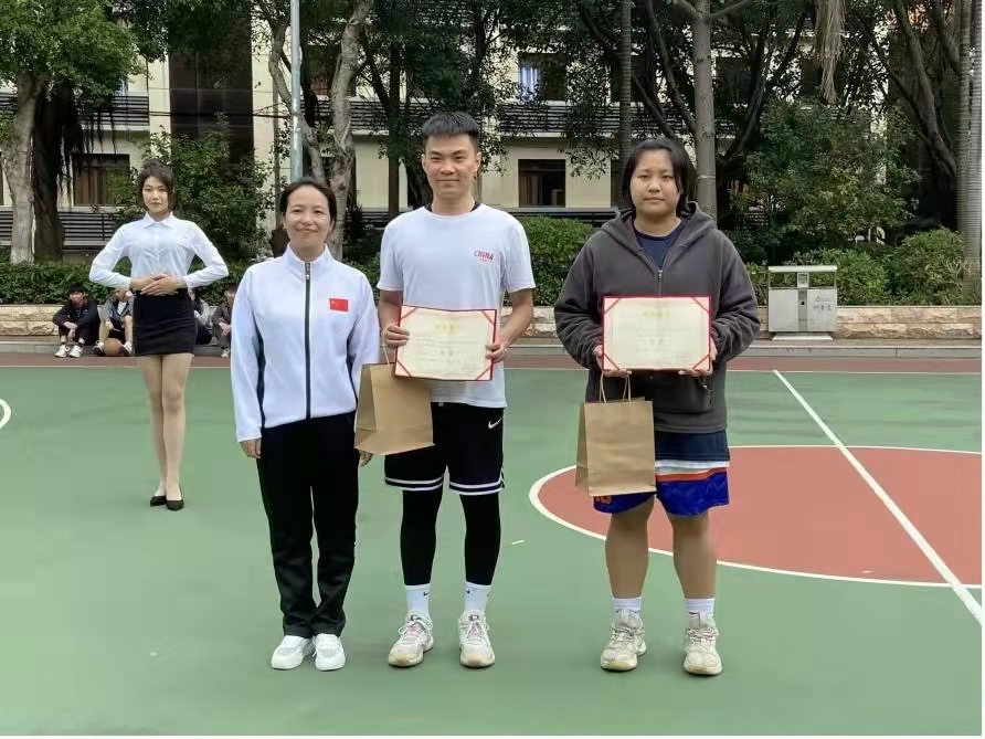 公司党总支书记杨惠为本次“专业杯”篮球赛冠军男子组东北饺子馆队和女子组YYDS队颁发奖状。