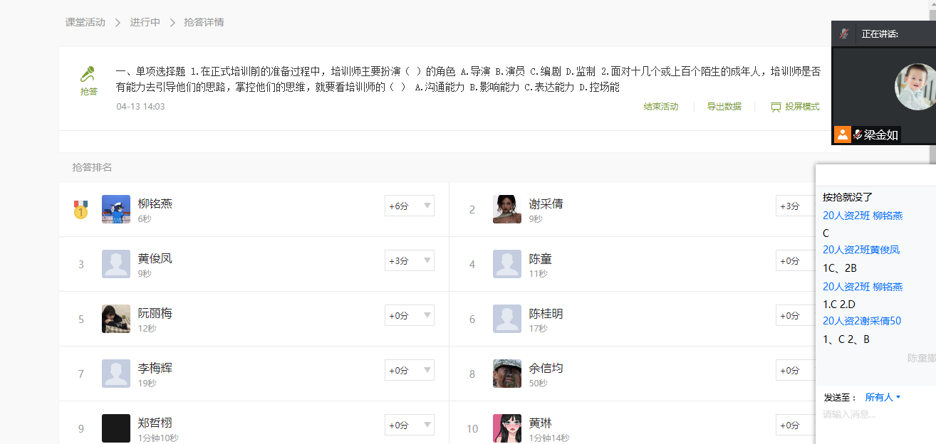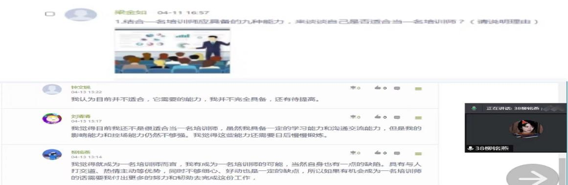 梁金如老师的《培训与开发》课程在腾讯会议的在线直播课堂中,还利用学习通平台与员工进行远程开展测试、问题讨论(图2)、抢答(图3)、视频讨论(图4)等丰富有趣的方式参与学习活动,有效提高员工课堂参与活动的积极性,改变被动式学习方式,以员工为中心,让员工成为课堂主人,提高员工的学习兴趣,加深员工对所学内容的理解及记忆。