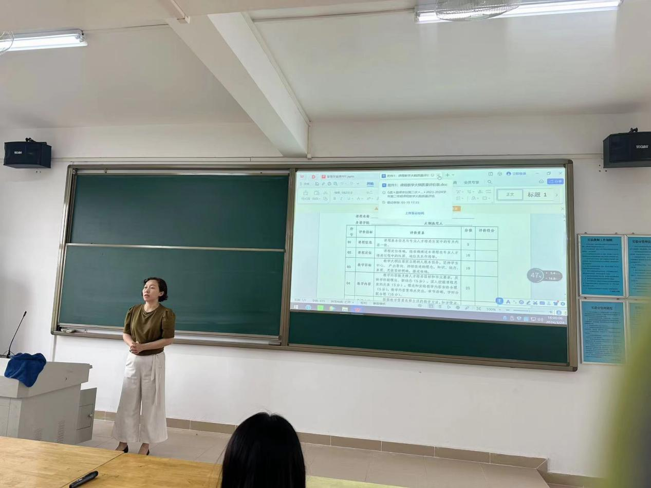 活动伊始,课程组组长徐文婧老师首先为大家解读了教案和教学大纲质量评估的相关通知。她深入剖析了评估标准和流程,强调了教案和教学大纲在提升教学质量中的重要作用。随后,王富喜教授以丰富的教学经验,分享了大纲撰写的技巧和方法,为在场老师提供了宝贵的参考。