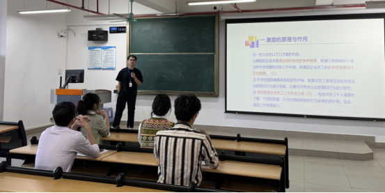 研讨会下半部分由魏子扬老师针对《销售管理》课程中《销售人员的激励》这一章节的内容展开教学试讲。内容上首先是介绍该章节的学习目标,并且阐明后面所学内容与该些学习目标的对应关系;其次在教学设计中的课堂预热环节,设计“如何定义外在性需要和内在性需要?”、“‘激励’在员工开展销售业务工作的全过程中分别起到什么作用”两个开放性问题,引起员工求知兴趣,引导员工发散思维并结合自身所闻所见发表看法,为讲授新课营造良好的教学氛围;再而是有关教学拓展部分,引入了现今企业重视且积极建立的员工反馈机制——反馈循环,通过多个方面向员工介绍企业构建反馈循环的必要性以及该机制对公司运行、优化、发展的意义,让员工明白反馈机制与员工激励的联系。
