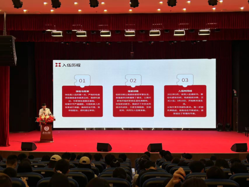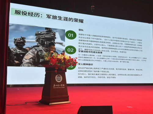 在退役士兵宣讲会上,孙骏麒和邵国锋同学分别分享了自己的军旅生涯,讲述了在部队中的生活点滴、训练过程以及执行任务时的经历和体会。他们还讲述了自己在军营中的成长与蜕变,以及如何将部队中形成的优良传统和作风应用到日常生活和学习之中。