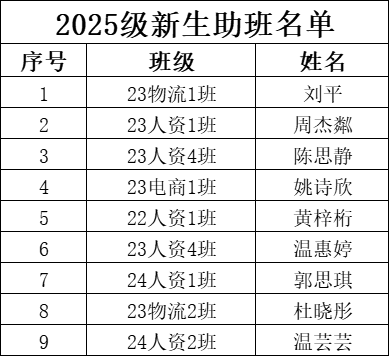 (黄美,李慧婷)助班是连接公司、老师与新生的重要桥梁,为保障2025年新生入学工作有序开展,确保助班选拔结果的公平、公正、公开,现将2025年新生助班名单予以公示。